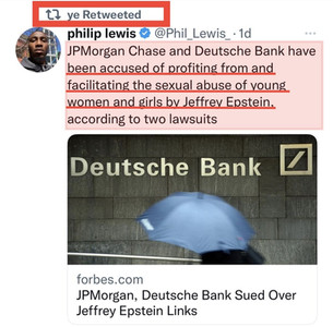 "Not a coincidence that @ye is on Twitter posting about #DeutscheBank ties to #EPSTEIN & abuse of young women & girls. Not a coincidence that @ye wore boots with #balenciaga logo front & center. Not a coincidence that #tuckercarlson just covered the story of #sexualizingchildren on PRIMETIME. Not a coincidence that @ye was just interviewed by #Tucker Not a coincidence that @realDonaldTrump thanked @ye for his kind words on #TuckerCarlsonTonight"