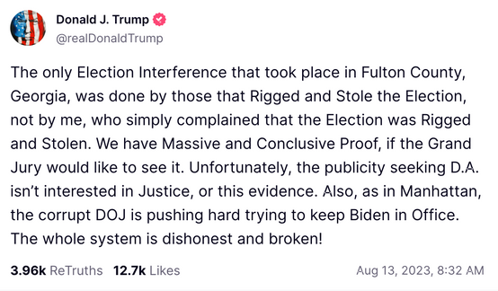 "Not going to make any impact because every time they file an indictment we go way up in the polls. We need one more indictment to close out this election, one more indictment and this election is closed out. Nobody has even a chance, we've already defeated the Republicans." President Trump