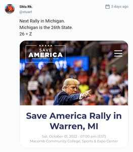 Trumps Save America Rally in Warren, Michigan. Michigan is the 26th State - 26 = Z! Boom. Many of the things Trump says at his rallys are also in his truths on Truth Social, then he repeats it at the rallies. #SMART Trump: "The silent majority is back."