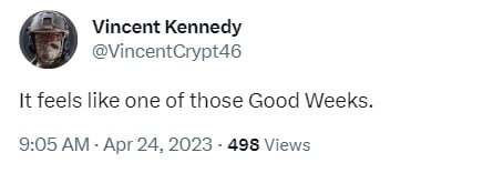 Vincent Kennedy writes, It feels like one of those Good Weeks - Time stamp - 9:05 = 14 = 5 = . Apr 24 = 10 = 5.5 = Loud and clear.